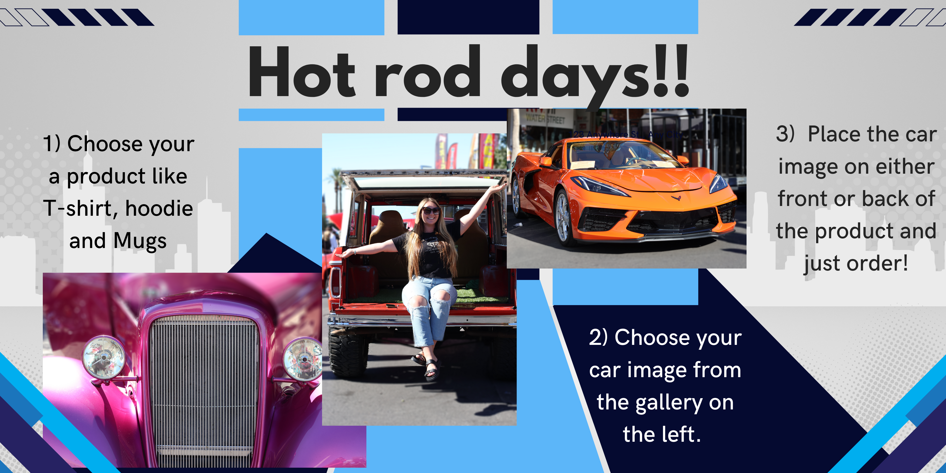 Once you hit the button below it will take you to our customizing section. Click the product you want like a T shirt. Then on the Left (Or bottom if using a phone) click the gallery (puppy face on a phone) and pick out your car. Size it in the box and place your order.